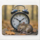 A small mouse peacefully sleeps next to a retro alarm clock on a tree stump surrounded by autumn leaves, set against a backdrop of a forest scene filled with warm autumn colors