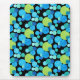Um Mousepad de cor vibrante com um padrão de abstrato 'Luas Azuis' em azul brilhante e verde neon em fundo preto; de um design de colagem de papel pintado à mão por Judy Adamson.