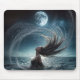 Uma mulher emerge do oceano, seu cabelo molhado criando um arco dramático contra o céu noturno com uma lua de cheio