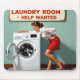 Uma mulher em uma roupa retrô se inclina sobre uma secadora de roupas brancas, com uma placa de "Ajuda da Sala de Lavanderia" sobre ela