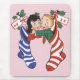 Ilustração de Vintage design de Natal Feliz com gêmeos pendurados em meias de Natal decorados com folhas e bagas sagradas. A menina está na meia listrada azul e branca e o menino está na meia listrada vermelha e branca. Bobo, imagem engraçada e humorística, excelente para toda a família!