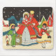 Vintage ilustration Victorian Merry Christmas design com uma família a fazer carona numa noite fria de inverno com uma cidade fofa ao fundo. Esta pequena aldeia tem casas com fumaça a subir as chaminés, neve no chão e estrelas no céu. Quase se pode ouvir a música da Noite Silenciosa. A mãe guarda o livro de música enquanto o pai canta sobre o ombro e as crianças musicais estão de ambos os lados.