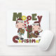Duas vacas em bonés de meia, presentes do Natal, luzes do feriado, bastões de doces, e texto vermelhos que lê de "o Natal Mooey" em t-shirt do feriado, canecas, cartões, etiquetas, sacolas, pulsos de disparo de parede, caixas da lembrança, ornamento, chaveiro, e outros roupa e presentes bonitos do feriado do tema da vaca.