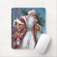 Um tapete do rato encantador do natal vintage que caracteriza o Natal do pai em sua maneira através da neve carregou com os brinquedos e uma árvore de abeto.