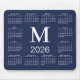 Minimal calendar mouse pad features a white 2026 calendar on a navy blue background with a bold custom monogram above the year in the middle. Add your initial in the sidebar.