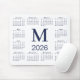Minimal calendar mouse pad features a navy blue 2026 calendar on a white background with a bold, dark blue custom monogram above the year in the middle. Add your initial in the sidebar.