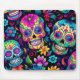 Um mosaico hipnotizante de crânios coloridos de açúcar dançando no escuro. Dia De Los Muertos em um mouse pad para seu escritório ou para dar de presente nos aniversários e nos dias de celebração.