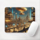 Uma cidade boiada flutuante à noite, iluminada por lanternas brilhantes e tubos semelhantes a neon. Cidadãos vestidos de vitoriana caminham pelos corredores suspensos, enquanto os aeróstatos atracam em plataformas de torre. O céu escuro, repleto de estrelas cintilantes, melhora a atmosfera mística dessa metrópole aérea.