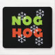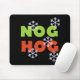 Texto vermelho e verde brilhante com flocos de neve brancos diz "Nog Hog" em T-shirts de feriado, sacos de tote, camisas, botões, e mais, perfeito para qualquer pessoa que ame ovos e que esteja à procura de uma design de férias divertida, fofa e algo humorística!