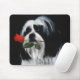 Um Cachorro Shih Tzu criou uma fotografia segurando um rosa na boca.
