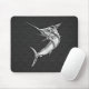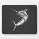 Um cromo de prata como peixes do espadim applique o design em uma decoração do fundo do estilo da fibra do carbono. Um presente náutico moderno atrevido.