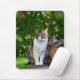 Um gato se senta no jardim verde, próximo a um tronco e olha à frente