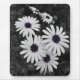 Esta imagem mostra um aglomerado de margaridas com pétalas brancas e polos púrpuros-azuis em greve. O fundo e a folhagem estão em preto-e-branco, criando um efeito colorido seletivo que enfatiza as cores vívidas dos centros das flores. O contraste entre os arredores dessaturados e as delicadas flores dá à imagem uma qualidade artística, quase surreal, destacando a beleza e a complexidade da natureza.