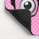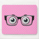 Óculos pretos com globos oculares em bolinhas brancas e fundo rosa.