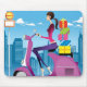 Opinião lateral a mulher com os presentes no patinete. Copyright: Eastnine Inc.