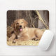 Este mouse canino divertido apresenta uma imagem de um Ouro amarelo/marrom feliz, descansando no dentro de feno de um celeiro de madeira.