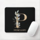 Florial do monograma da letra P. A letra P na textura marrom ouro acentuada com folhas compostas de cor aquosa verde, flores e pó de ouro. Personalizado com o nome na fonte correspondente.
