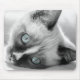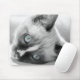 Mouse pad com um gatinho branco, de olhos azuis, com uma faixa branca no nariz. Foto tirada em Pasadena, Califórnia.