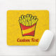 Ilustração de desenho animado de pequenas embalagens de batatas fritas em fundo sem costura de comida de lixo amarelo. Texto personalizado.