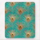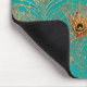 Bonito padrão de penas de pavão com brilho de ouro em fundo aqua.