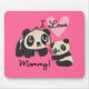 Um urso de panda das mamães e do bebê projeta com um fundo e um texto cor-de-rosa e uns corações e um texto que leia mamães do amor de I em t-shirt, bodysuits, canecas, cartões, etiquetas, as bolsas, ímãs, e um mais brancos.
