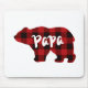 Design do Papá Bear com detalhes de xadrez de búfalo vermelho e preto.
