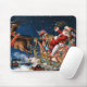 Um outro tapete do rato encantador do natal vintage que caracteriza Papai Noel que monta seu cheio do trenó dos brinquedos acima de uma cidade do inverno.