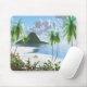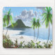 Paradise Island (2014) I wanted to update my original Paradise Island print I did back in 2010. My skills and software have evolved enough for me to consider a rework of my most popular tropical design. This is truly an island of paradise, however your not alone in this paradise as someone has built a sand castle on the beach. Lush, green tropical coconut palm trees stand tall on the white sandy beach with green and red tropical leafy plants in the foreground. The deep blue tropical waters sparkle under the sunny sky. Not far off the beach there is another tropical island covered with green tropical plants.