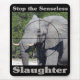 Uma aproximação de um elefante africano na cruz tem as palavras Parar o Massacre Sem Senso ao seu redor.
