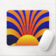 A parede do tijolo de Grafite solar é uma obra digital de arte com um fundo azul escuro de gradiente e um sol amarelo de gradiente laranja avermelhado no fundo, feixes de sol se enrolando para cima e para fora.