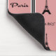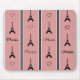 Ilustração Paris com Torre Eiffel e decoração cardíaca e design de texto de Paris sobre fundo listrado preto, branco e rosa