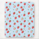 Um padrão lúdico cheio de morangos pintados à mão, pequenas flores brancas, e folhas verdes sobre um fundo pastel azul claro. Excelente para produtos com primavera ou impressões de tecido fofo.