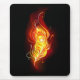 Pena de pavão brilhante feita de fogo e chamas sobre fundo negro.