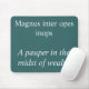 Um mousemat turquesa com uma frase latina em texto branco e a tradução em inglês por baixo. "Um pobre em meio à riqueza" é uma citação do poeta romano Horace.
