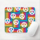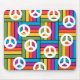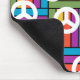 Este mouse pad tem um design de quadrados feitos de retângulos em cores brilhantes dos anos 70 com sinais de paz espalhados ao redor dele.