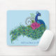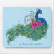 Um pavão com flor de fuchsia Lous e henna num pano de fundo azul-claro.