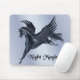 Design de fantasia com um Pegasus preto voador e texto dizendo "Noite Mágica".