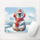 Um pinguim de aquarela fofo sentado em um icebergue vestindo um cachecol vermelho, chapéu e algemas.