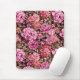A vibrant array of pink and orange peonies is artfully arranged against a dark background, creating an eye-catching and colorful floral pattern. The detailed blossoms are interspersed with rich green leaves, enhancing the lush appearance.