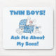 A orgulhosa nova mãe e pai dos gêmeos bebês amará esta design bonitinha com dois coelhos de menino e texto azul que diz "Twin Boys! Pergunte-Me Sobre Os Meus Filhos!" T-shirts, cartões, botões, magnetos, bolsas, mousepads e muito mais!
