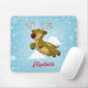 Uma bela imagem de desenho animado de uma adorável rena de natal voando no céu com flocos de neve e nuvens ao fundo. Personalize com um nome.