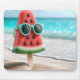 Um picolé de melancia com óculos de sol em areia de praia com pano de fundo cênico do oceano