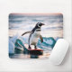 Pinguim giro numa prancha de surfe e onda oceânica.