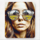 Legal arte ai representando uma mulher em óculos de sol com um reflexo de um show musical de festival ao ar livre neles.