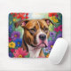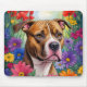 Um cão pitbull, castanho e branco, com expressão séria, é representado num jardim floral vibrante. A cabeça e os ombros do cão são o ponto focal, cercados por uma profusão de flores coloridas. As flores são uma mistura de papoilas vermelhas, margaridas amarelas, e vários tons de rosa, roxo e azul. O fundo é uma lavagem aquosa e macia de cor azul e verde, sugerindo um dia ensolarado. Ideal para amantes de pit bull.