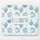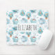 Um mouse pad com um padrão cômico com baleias sorridentes bonitinhas nadando alegremente no mar.