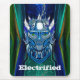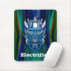 Mousepad de aparência futurística, com trabalho de arte gráfico de Uma cabeça de robô azul metálico com correntes elétricas subindo e descendo dela. O texto personalizado, na parte inferior, está pronto para personalizar para ler o que você quer.