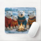 Four polar bears are sitting around a small campfire, wearing colorful knitted sweaters, with an icy, picturesque landscape surrounding them