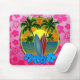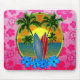 Por do sol bonito da praia atrás das prancha e das palmeiras, quadro com as flores do bambu e do hibiscus. Com um fundo cor-de-rosa de tartarugas de mar de Honu e de flores havaianas do hibiscus.