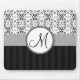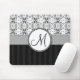 Uma imagem digital sem emenda do teste padrão do damasco preto e branco na parte superior, e listras envelhecidas do estilo do cetim do preto do vintage na parte inferior, com uma fita overlay com um selo customizável do texto do monograma.